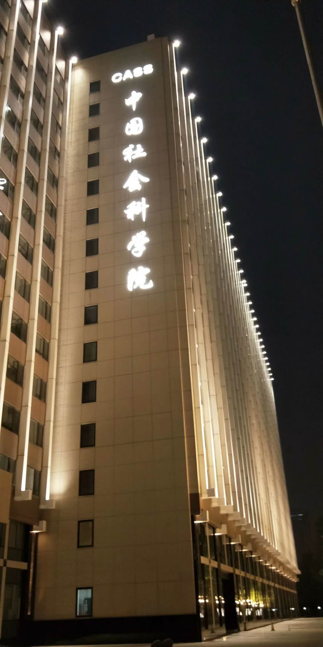 設(shè)置不同的場(chǎng)景模式可以讓夜色中的照明無(wú)需再在長(zhǎng)時(shí)間內(nèi)保持同一種過(guò)高的亮度照明需求,那樣所產(chǎn)生的電量也是沒(méi)有必要的。利用調(diào)光模塊可根據(jù)時(shí)間人流量大小來(lái)設(shè)定亮度,一鍵切換,方便快捷。下圖是社會(huì)科學(xué)院在夜色中的照明亮化。