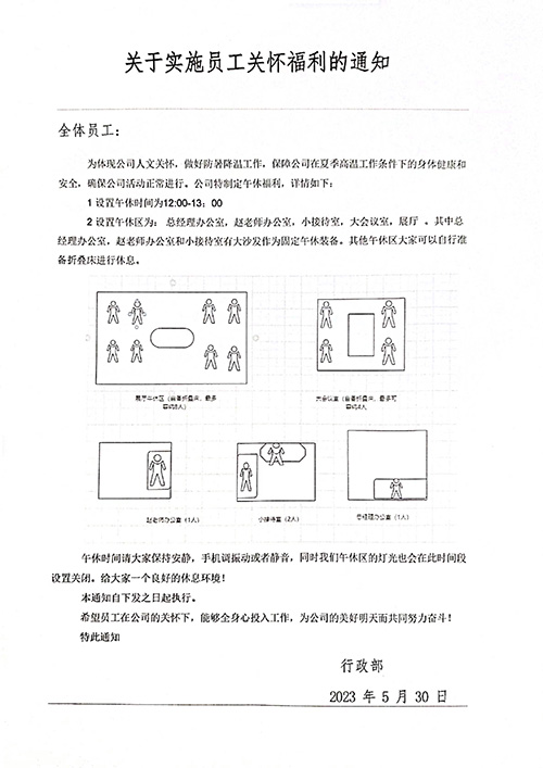 公司設置了午休區(qū)并購置了"午休神器",神器寬大柔軟,如折疊睡墊;配備的緩解頸部勞累的充氣枕,釋放了上午工作的疲勞。讓員工在午休時間休息好,養(yǎng)足精神,不是一件小事。該通知讓員工感受到了企業(yè)大家庭的溫暖,也是企業(yè)人文關懷的真情體現(xiàn),獲得大家的一致好評點贊,也使得下午的工作更加投入用心。