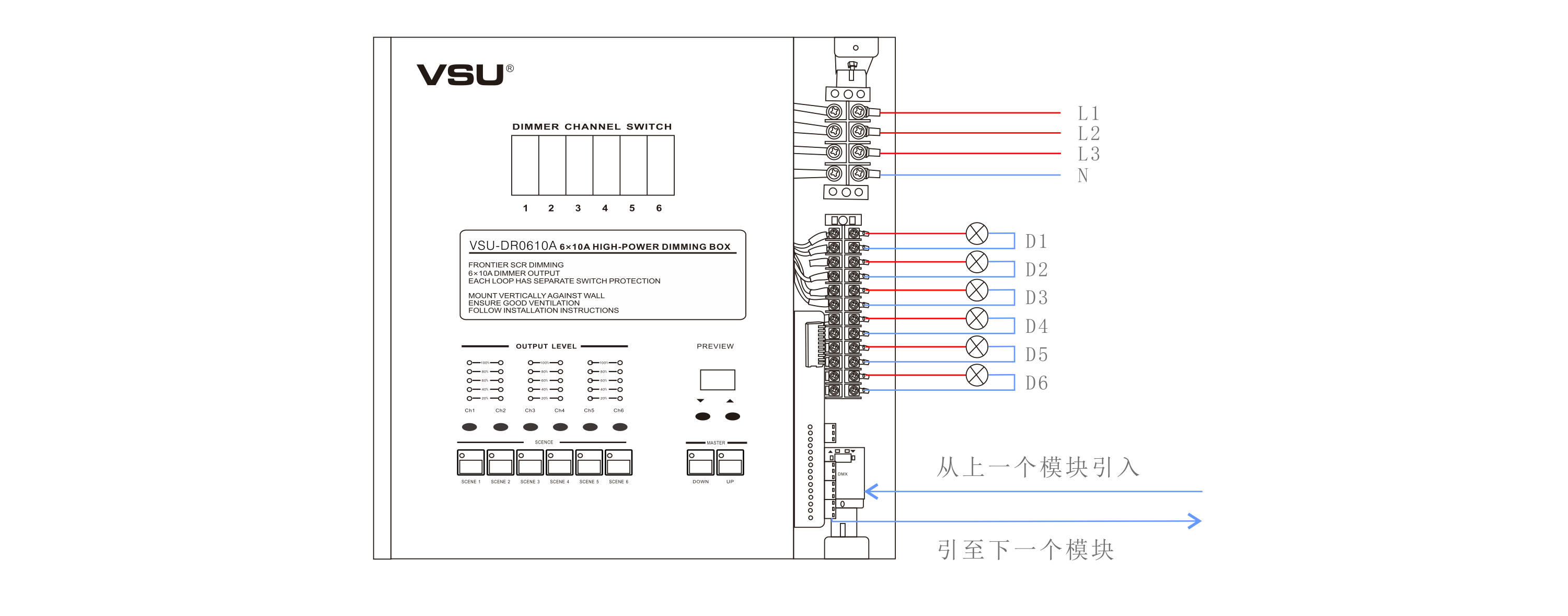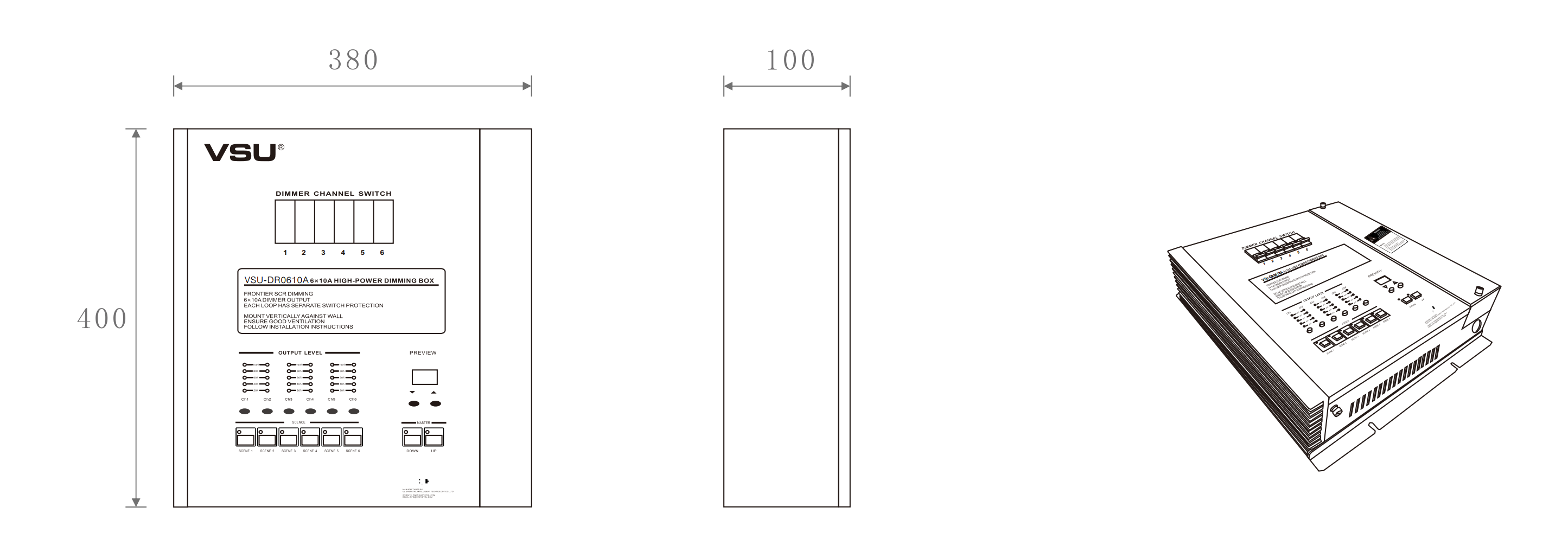 本產(chǎn)品為掛壁式安裝,可控制6路10A(2200W)的射燈、筒燈和白熾燈等的電壓調光,輸出調光類型為前沿斬波調光;機箱采用輕巧型設計美觀大方。帶斷路器保護. |