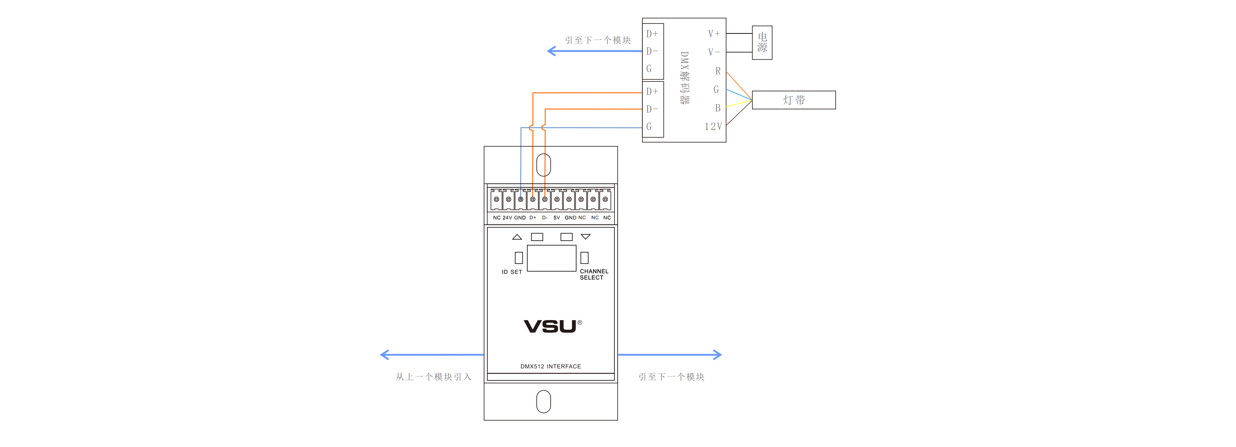 本產(chǎn)品通過VSU-Net總線控制DMX512信號的設(shè)備,可控制32個DMX通道,自帶場景功能,可查詢各個回路狀態(tài);可給LED燈帶、RGB燈帶調(diào)光、調(diào)色;