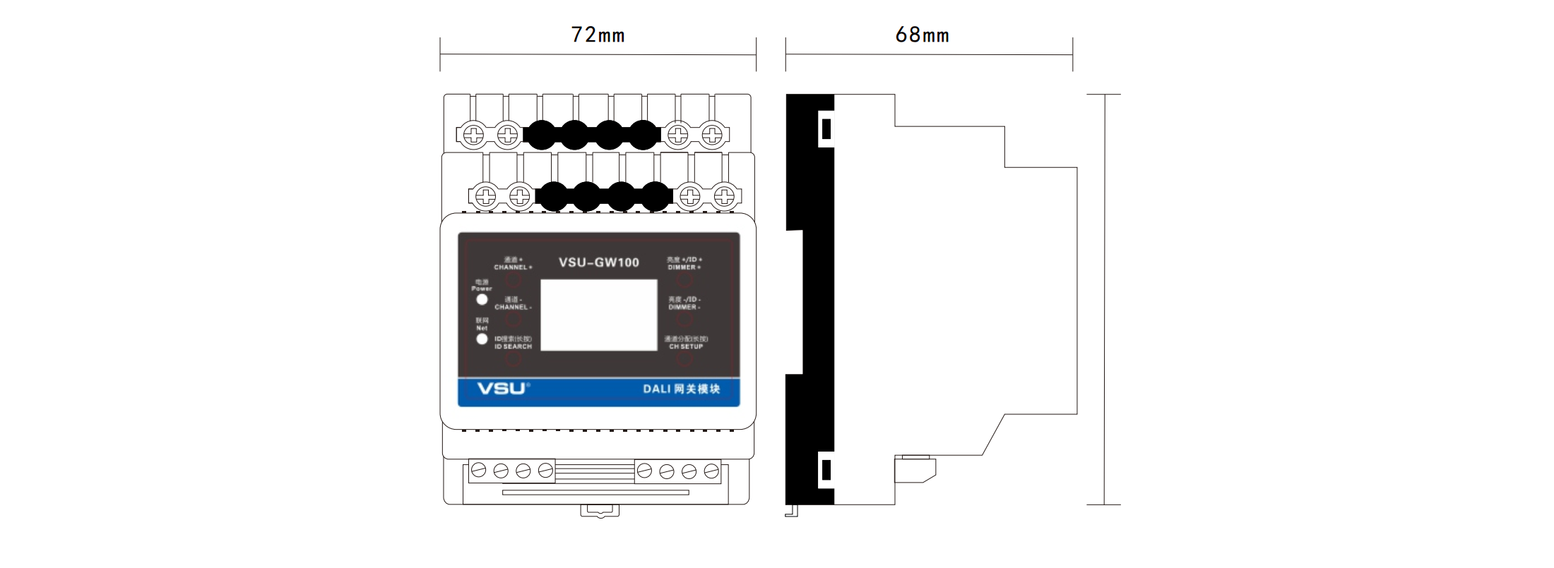 DALI網(wǎng)關(guān)支持VSU-NET協(xié)議與DALI協(xié)議的轉(zhuǎn)換,模塊內(nèi)置DALI電源,具有單條DALI總線,最多支持64個DALI燈光設(shè)備,最多可具有16個控制通道。模塊采用OLED顯示屏,方便工程配置與調(diào)試 |