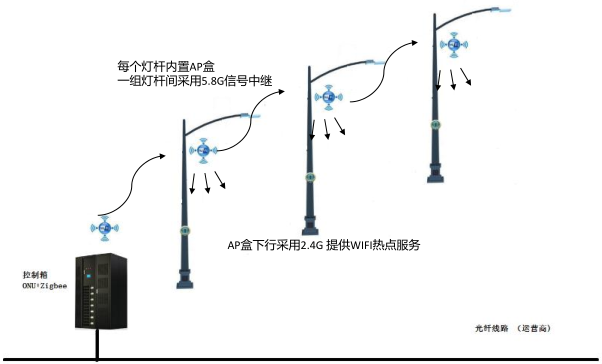 采用運營商光纖網(wǎng)絡(luò)比無線4G更加穩(wěn)定,在不具備部署光纖的區(qū)域,可以使用4G微基站。采用5.8G信號在燈桿間做Mesh,同時提供下行2.4G頻段作為AP上網(wǎng)使用。