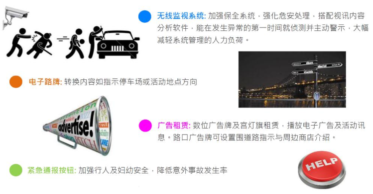 智慧路燈桿是一種集成各種信息設(shè)備技術(shù)創(chuàng)新復(fù)合應(yīng)用的智慧路燈產(chǎn)品,整個智慧燈桿內(nèi)包含路燈照明控制系統(tǒng)、WIFI天線基站、視頻監(jiān)控管理、廣告屏播控系統(tǒng)、城市環(huán)境實時監(jiān)測、緊急呼叫系統(tǒng)、水位監(jiān)測、充電樁系統(tǒng)和井蓋監(jiān)測系統(tǒng)等應(yīng)用。
